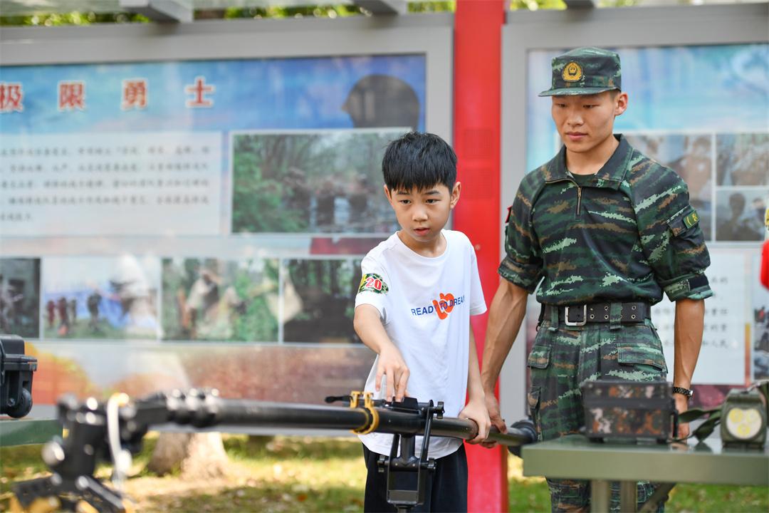 圖為軍娃在武警合肥支隊營區(qū)體驗武器裝備。
