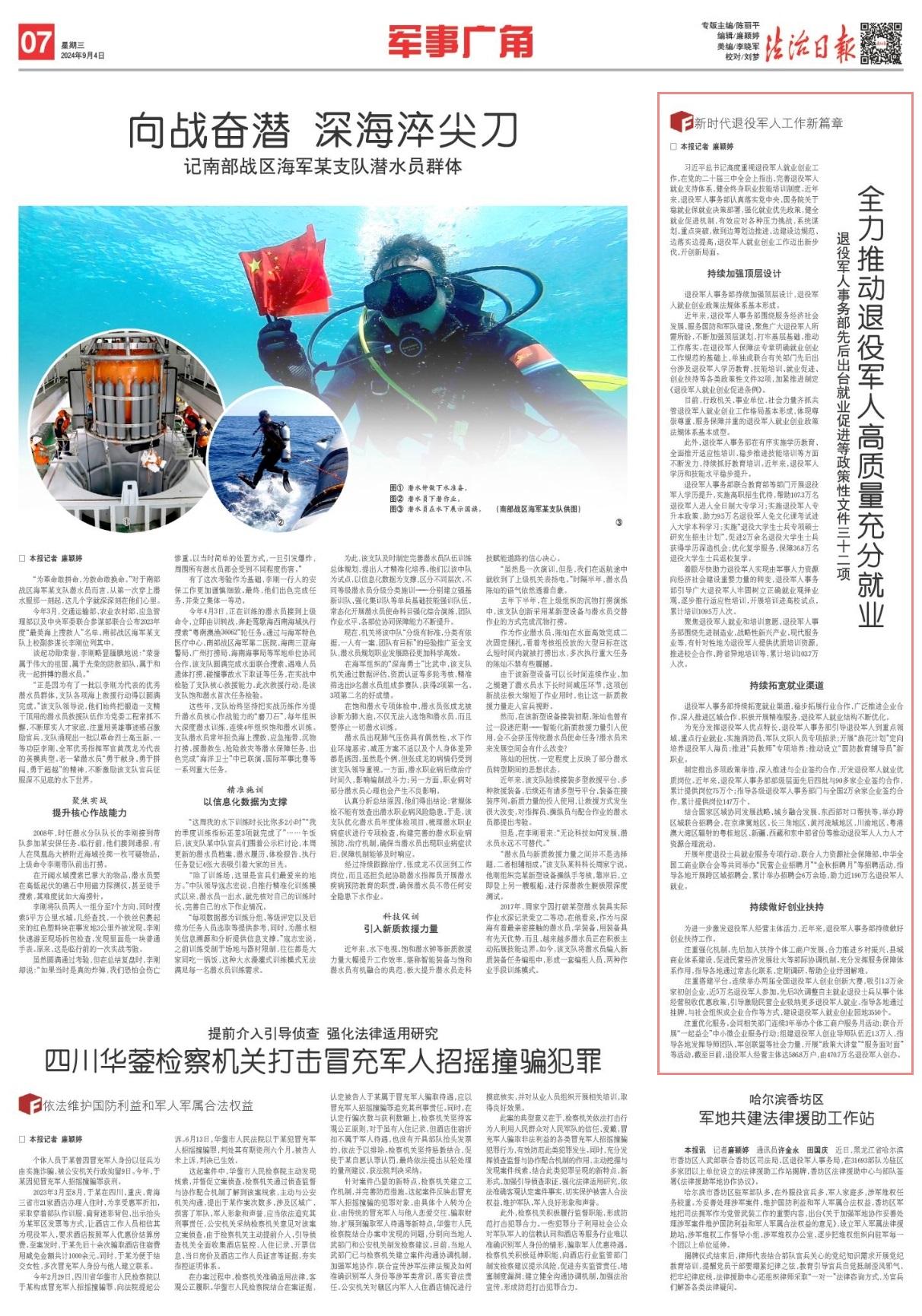 為充分發(fā)揮退役軍人優(yōu)點(diǎn)特長,退役軍人事務(wù)部引導(dǎo)退役軍人到重點(diǎn)領(lǐng)域、重點(diǎn)行業(yè)就業(yè)。實(shí)施消防員、軍隊(duì)文職人員專項(xiàng)招錄;開展“浪花計劃”定向培養(yǎng)退役軍人海員;推進(jìn)“兵教師”專項(xiàng)培養(yǎng);推動設(shè)立“國防教育輔導(dǎo)員”新職業(yè)。