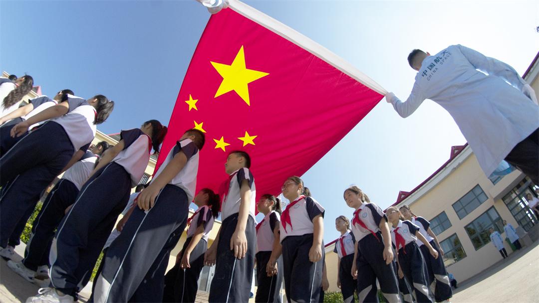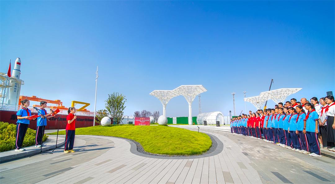 少先隊員代表在國旗下獻詞,堅定自信的眼神、熱烈飽滿的情緒、鏗鏘有力的聲音,表達新時代少先隊員對祖國的熱愛、對航天的向往。