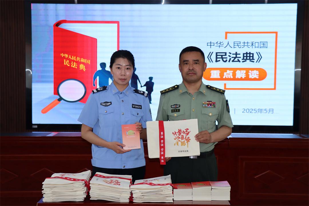 圖為應(yīng)縣司法局工作人員向該縣人武部贈(zèng)送民法典等普法書籍。李柱華 攝