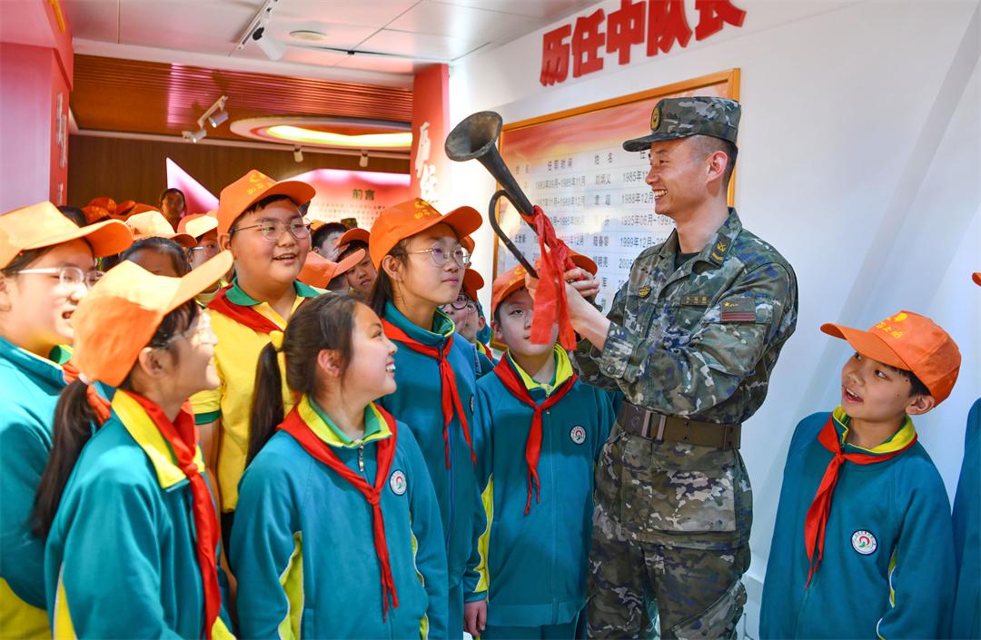 圖為在軍營開放日活動中,中隊戰(zhàn)士向?qū)W生講述老軍號的故事。徐偉 攝