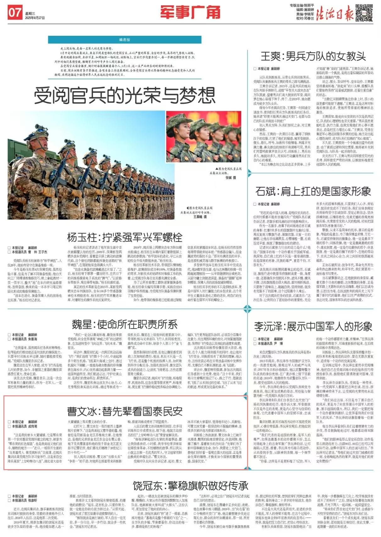 訓(xùn)練場上熱浪滾滾,曹文冰身上已被汗水浸透,黝黑的臉龐表情堅定。休息間隙,他擦了擦汗,看著家鄉(xiāng)的方向說:“先輩們?yōu)榱诵轮袊瞰I出生命,如今,我要走上天安門,替他們好好看一看現(xiàn)在強大的祖國。正是革命先輩的犧牲,才換來如今國家的繁榮昌盛、國泰民安?!?/p>