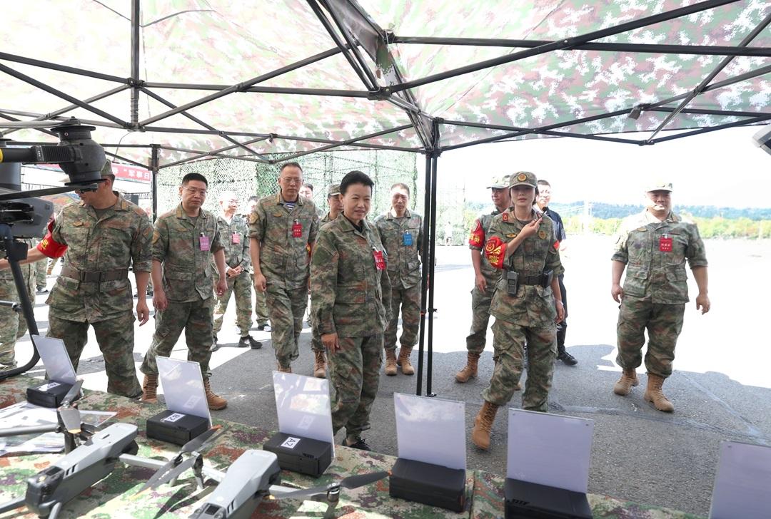 圖為觀摩特色民兵分隊(duì)無人飛行設(shè)備。