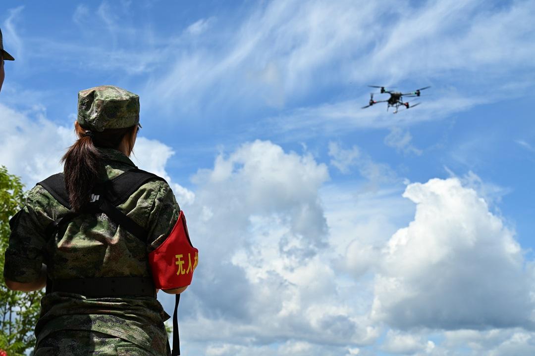 圖為“一曼”女子民兵分隊(duì)無人機(jī)操作手進(jìn)行課目演示。