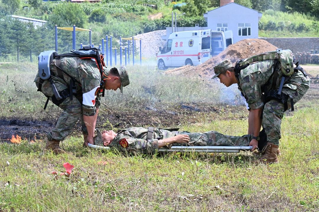 圖為“綠盾”特色民兵分隊(duì)使用外骨骼設(shè)備進(jìn)行戰(zhàn)場傷員救治課目演示。