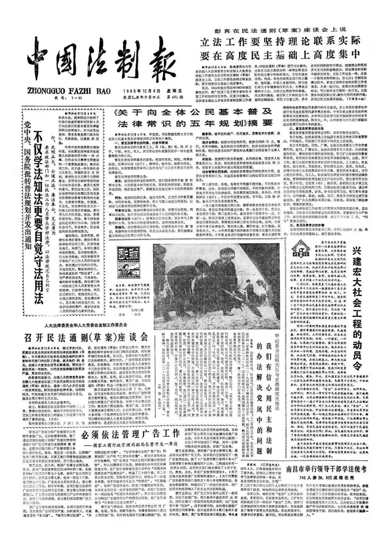 1985年11月5日,中共中央、國務院發(fā)出通知,轉(zhuǎn)發(fā)中央宣傳部、司法部《關(guān)于向全體公民基本普及法律常識的五年規(guī)劃》。通知明確指出,全民普及法律常識是我國人民政治生活中的一件大事,是社會主義精神文明建設的一個重要組成部分。同年11月22日,《全國人民代表大會常務委員會關(guān)于在公民中基本普及法律常識的決議》由六屆全國人大常委會第十三次會議通過。自此,國家以五年為周期,有計劃、有步驟地在全體公民中開展法治宣傳教育,全民普法正式走進千家萬戶的日常生活。