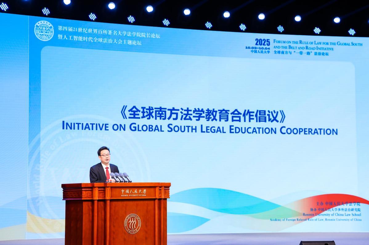 圖為中國人民大學(xué)法學(xué)院院長楊東在論壇主會場開幕式上發(fā)布《全球南方法學(xué)教育合作倡議》。