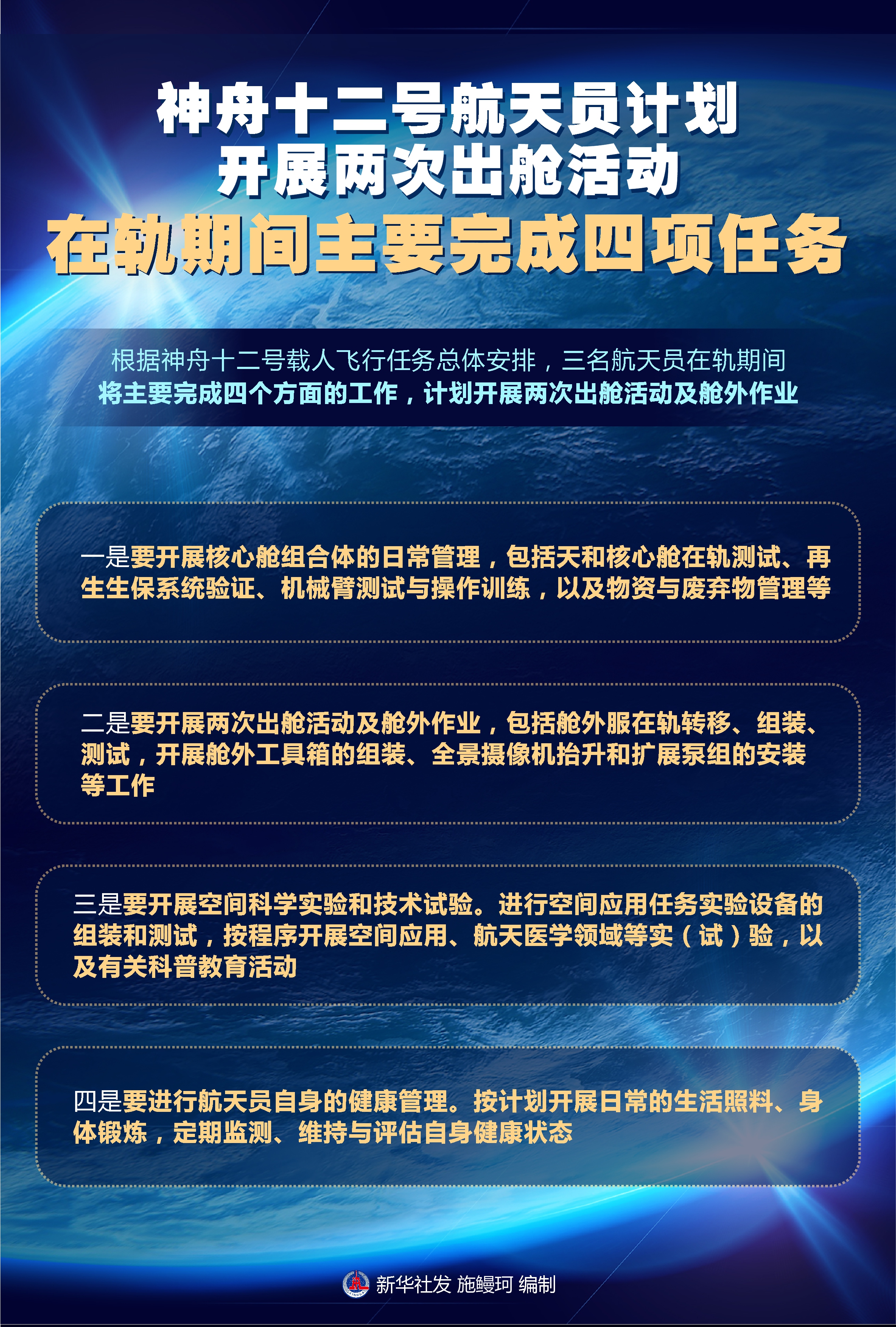 圖表:神舟十二號航天員計(jì)劃開展兩次出艙活動(dòng) 在軌期間主要完成四項(xiàng)任務(wù)