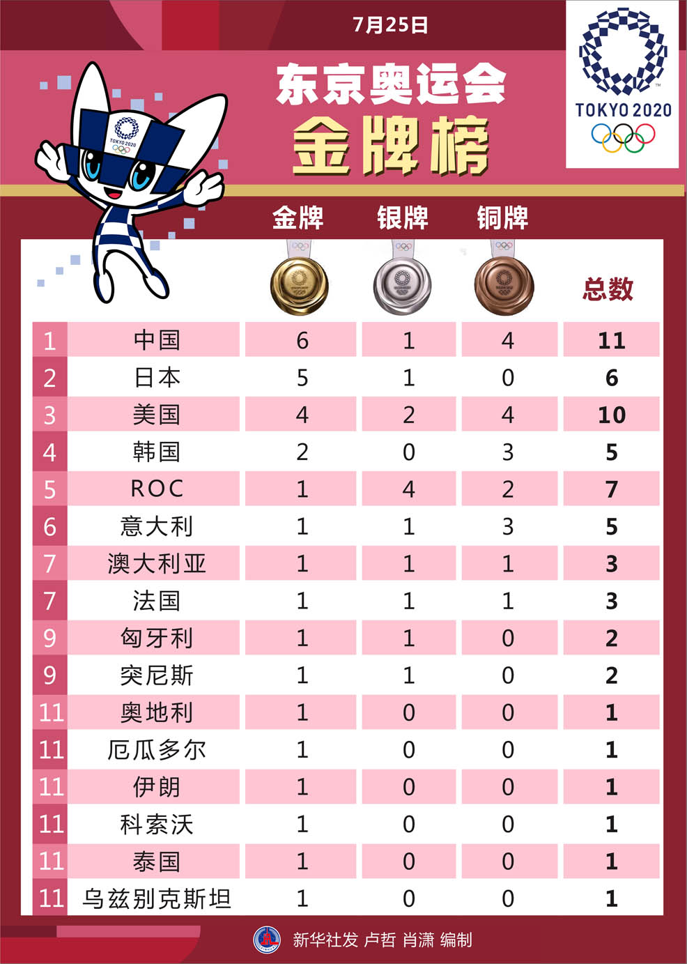 圖表:7月25日東京奧運(yùn)會金牌榜
