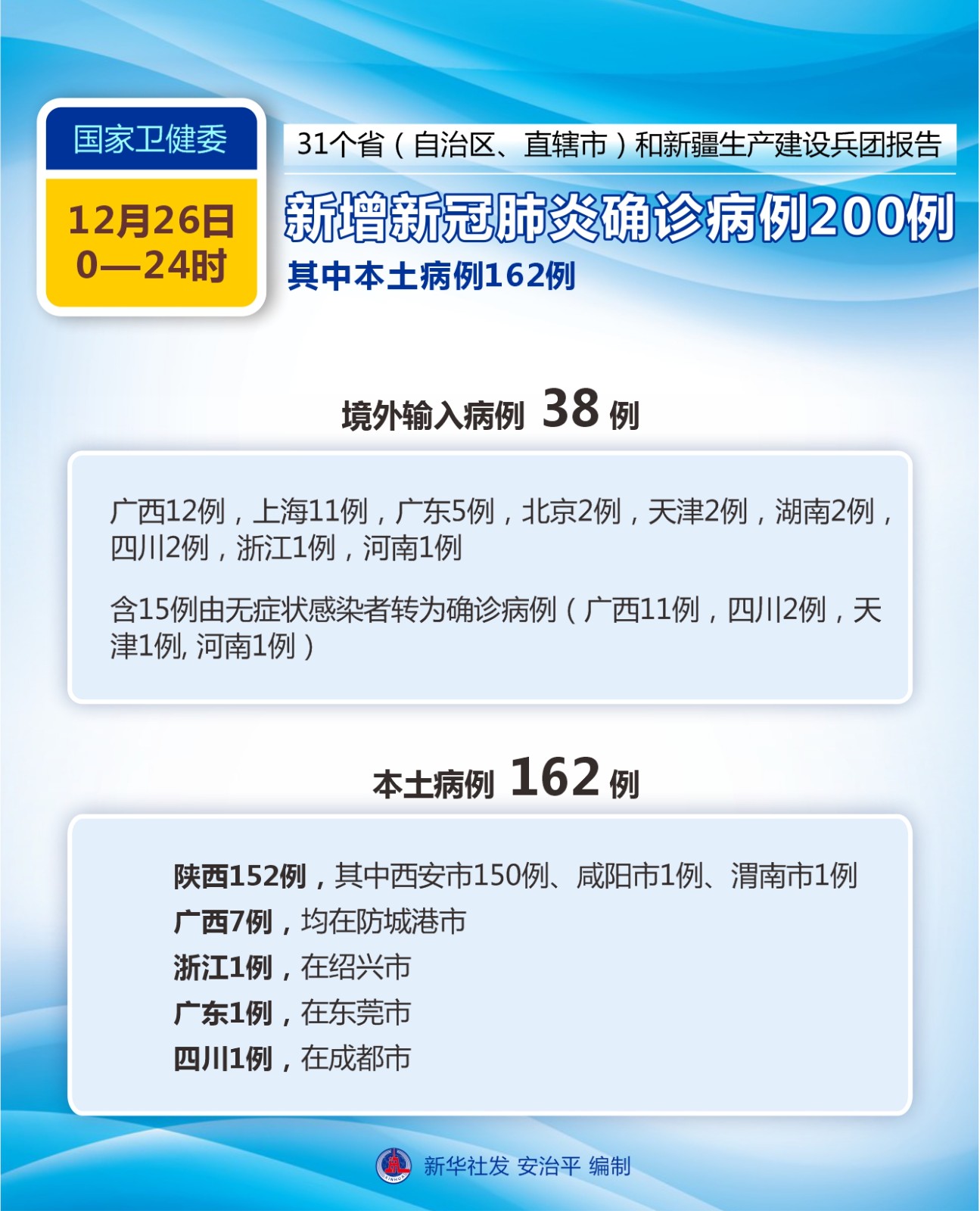 國家衛(wèi)生健康委員會12月27日通報,12月26日0至24時,31個?。ㄗ灾螀^(qū)、直轄市)和新疆生產(chǎn)建設(shè)兵團報告新增新冠肺炎確診病例200例。其中境外輸入病例38例(廣西12例,上海11例,廣東5例,北京2例,天津2例,湖南2例,四川2例,浙江1例,河南1例),含15例由無癥狀感染者轉(zhuǎn)為確診病例(廣西11例,四川2例,天津1例,河南1例);本土病例162例(陜西152例,其中西安市150例、咸陽市1例、渭南市1例;廣西7例,均在防城港市;浙江1例,在紹興市;廣東1例,在東莞市;四川1例,在成都市),含5例由無癥狀感染者轉(zhuǎn)為確診病例(均在廣西)。無新增死亡病例。新增疑似病例4例,均為境外輸入病例(上海2例,浙江2例)。