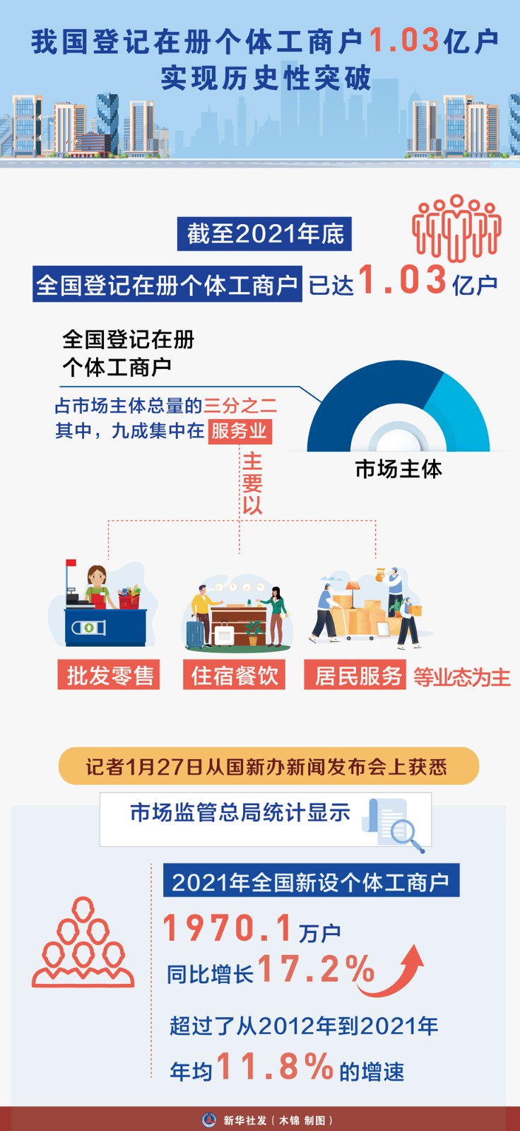 我國(guó)登記在冊(cè)個(gè)體工商戶邁上1億戶臺(tái)階,實(shí)現(xiàn)歷史性突破。截至2021年底,全國(guó)登記在冊(cè)個(gè)體工商戶已達(dá)1.03億戶,占市場(chǎng)主體總量的三分之二。其中,九成集中在服務(wù)業(yè),主要以批發(fā)零售、住宿餐飲和居民服務(wù)等業(yè)態(tài)為主。