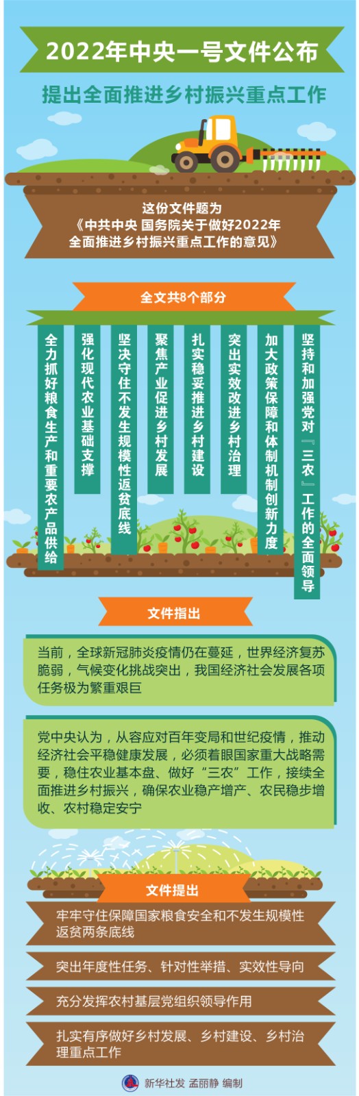 這份文件題為《中共中央 國務(wù)院關(guān)于做好2022年全面推進(jìn)鄉(xiāng)村振興重點(diǎn)工作的意見》,全文共8個(gè)部分,包括:全力抓好糧食生產(chǎn)和重要農(nóng)產(chǎn)品供給、強(qiáng)化現(xiàn)代農(nóng)業(yè)基礎(chǔ)支撐、堅(jiān)決守住不發(fā)生規(guī)模性返貧底線、聚焦產(chǎn)業(yè)促進(jìn)鄉(xiāng)村發(fā)展、扎實(shí)穩(wěn)妥推進(jìn)鄉(xiāng)村建設(shè)、突出實(shí)效改進(jìn)鄉(xiāng)村治理、加大政策保障和體制機(jī)制創(chuàng)新力度、堅(jiān)持和加強(qiáng)黨對“三農(nóng)”工作的全面領(lǐng)導(dǎo)。