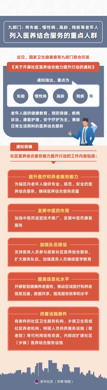 醫(yī)養(yǎng)結(jié)合是實現(xiàn)健康老齡化、滿足老年人健康養(yǎng)老服務(wù)需求的重要舉措。近日,國家衛(wèi)生健康委等九部門聯(lián)合印發(fā)《關(guān)于開展社區(qū)醫(yī)養(yǎng)結(jié)合能力提升行動的通知》。通知指出,重點為失能、慢性病、高齡、殘疾等老年人提供健康教育、預(yù)防保健、疾病診治、康復(fù)護理、安寧療護為主,兼顧日常生活照料的醫(yī)養(yǎng)結(jié)合服務(wù)。