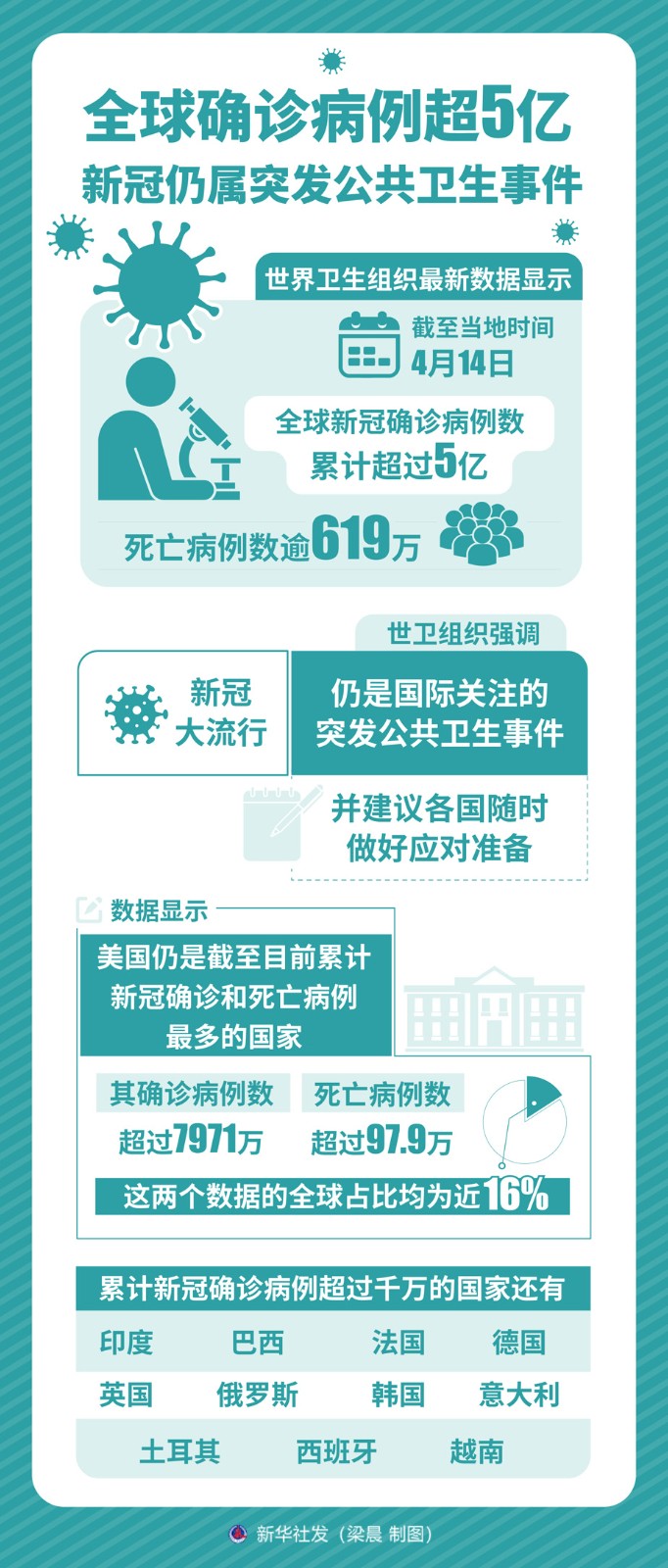 世界衛(wèi)生組織最新數(shù)據(jù)顯示,截至4月14日全球新冠確診病例數(shù)累計(jì)超過(guò)5億,死亡病例數(shù)逾619萬(wàn)。雖然全球新增確診和死亡病例數(shù)近期持續(xù)下降,但世衛(wèi)組織強(qiáng)調(diào),新冠大流行仍是國(guó)際關(guān)注的突發(fā)公共衛(wèi)生事件,并建議各國(guó)隨時(shí)做好應(yīng)對(duì)準(zhǔn)備。
