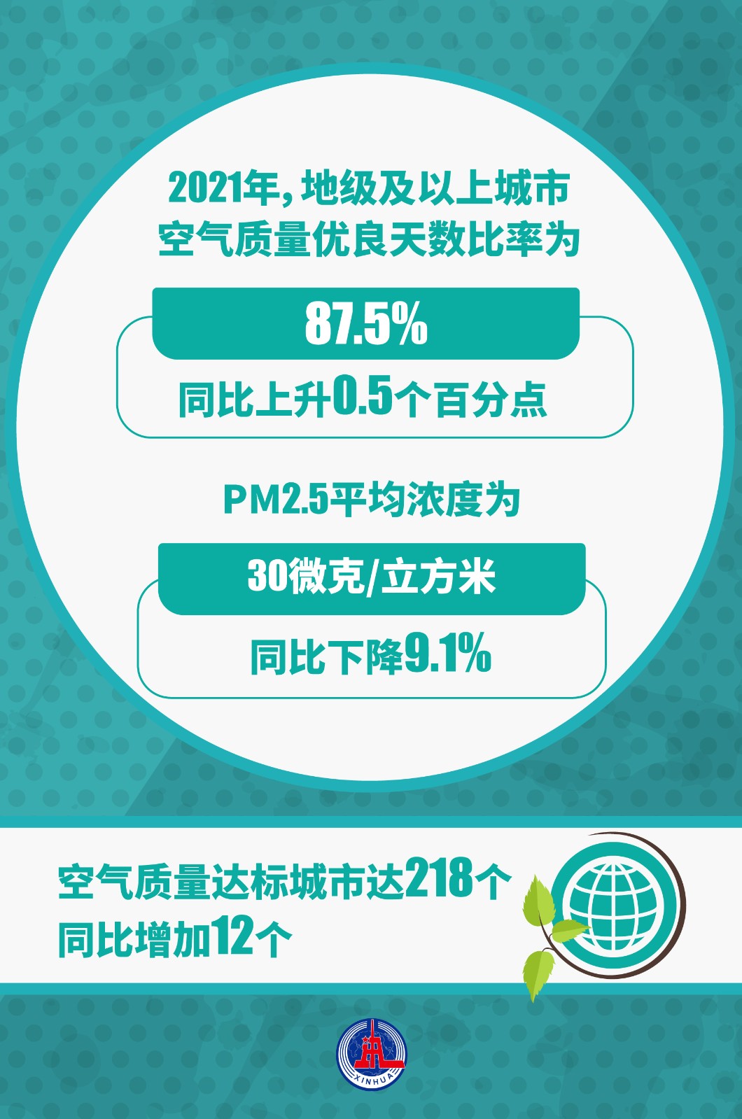 國務(wù)院關(guān)于2021年度環(huán)境狀況和環(huán)境保護(hù)目標(biāo)完成情況的報(bào)告4月18日提請全國人大常委會會議審議。報(bào)告顯示,2021年,地級及以上城市空氣質(zhì)量優(yōu)良天數(shù)比率為87.5%,同比上升0.5個(gè)百分點(diǎn);PM2.5平均濃度為30微克/立方米,同比下降9.1%??諝赓|(zhì)量達(dá)標(biāo)城市達(dá)218個(gè),同比增加12個(gè)。
