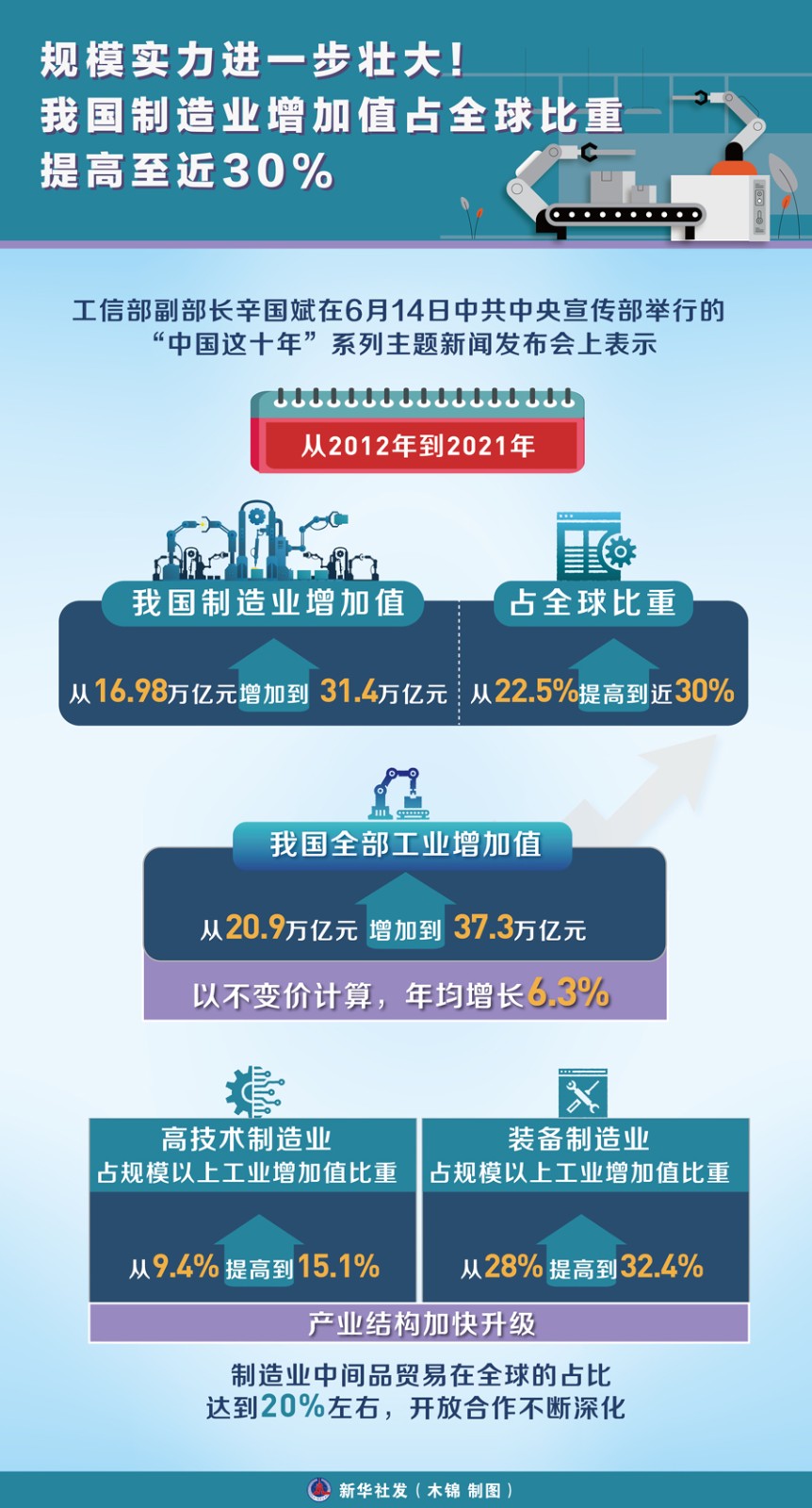 工信部副部長辛國斌在6月14日中共中央宣傳部舉行的“中國這十年”系列主題新聞發(fā)布會上表示,從2012年到2021年,我國制造業(yè)增加值從16.98萬億元增加到31.4萬億元,占全球比重從22.5%提高到近30%。制造業(yè)規(guī)模實力進一步壯大,夯實了經(jīng)濟發(fā)展的根基。