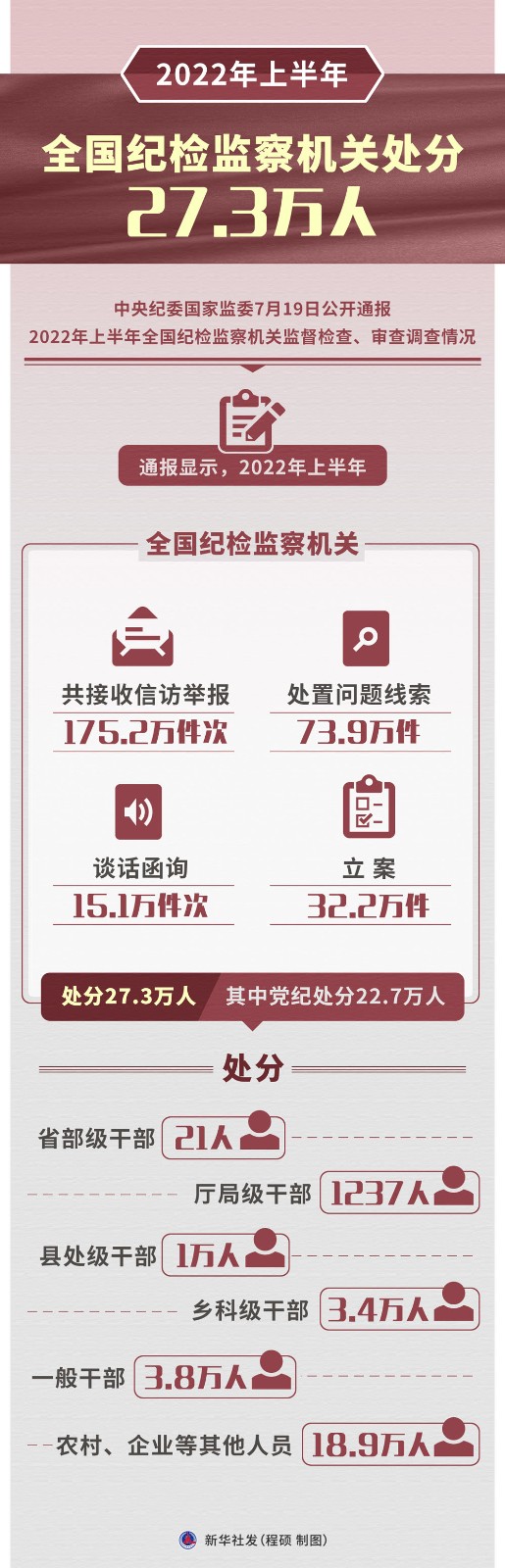 中央紀委國家監(jiān)委7月19日公開通報2022年上半年全國紀檢監(jiān)察機關監(jiān)督檢查、審查調(diào)查情況。2022年上半年,全國紀檢監(jiān)察機關共立案32.2萬件,處分27.3萬人,包括省部級干部21人。