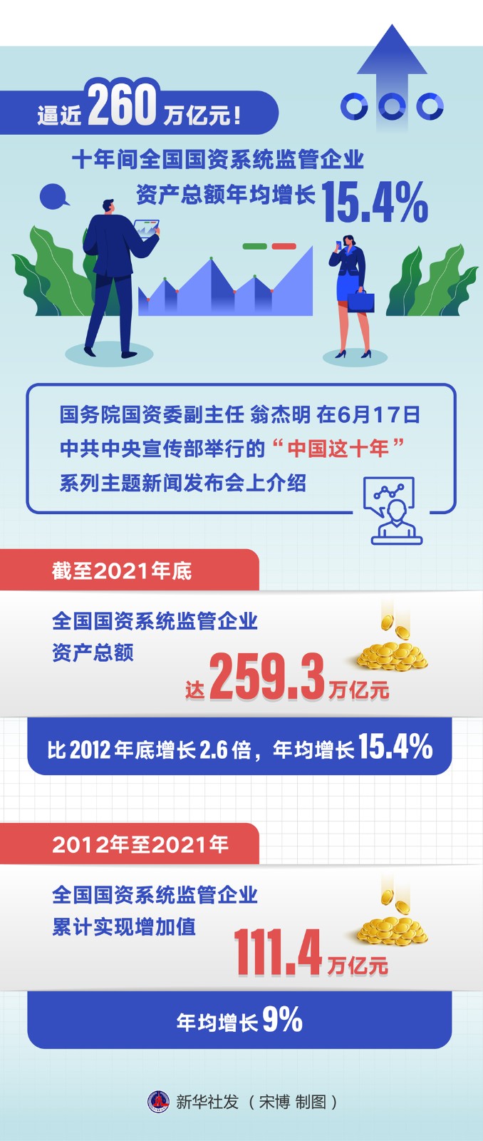 國務(wù)院國資委副主任翁杰明在6月17日中共中央宣傳部舉行的“中國這十年”系列主題新聞發(fā)布會(huì)上介紹,截至2021年底,全國國資系統(tǒng)監(jiān)管企業(yè)資產(chǎn)總額達(dá)259.3萬億元,比2012年底增長2.6倍,年均增長15.4%;2012年至2021年,全國國資系統(tǒng)監(jiān)管企業(yè)累計(jì)實(shí)現(xiàn)增加值111.4萬億元,年均增長9%。