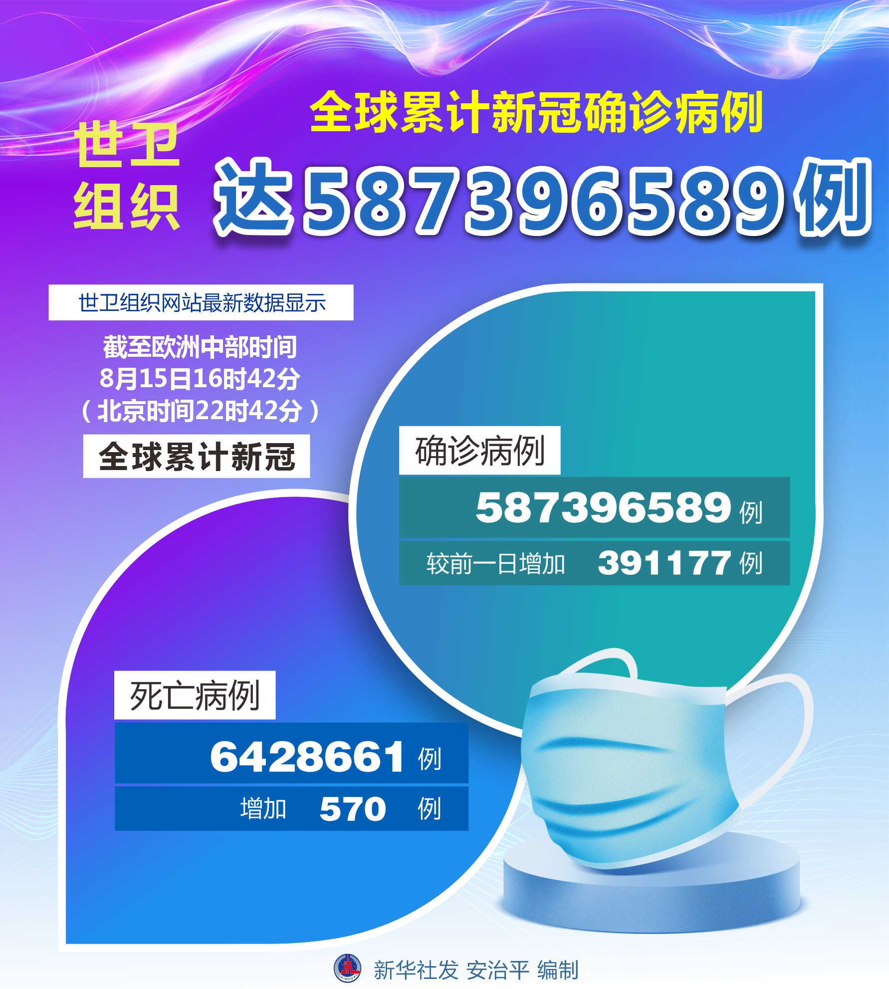 世界衛(wèi)生組織8月15日公布的最新數(shù)據(jù)顯示,全球累計新冠確診病例達587396589例。