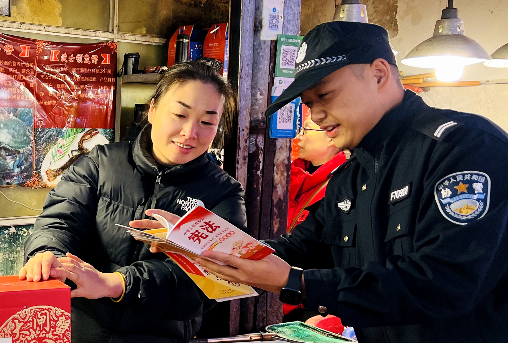12月4日,浙江省臺州市天臺縣公安局民輔警走進(jìn)農(nóng)貿(mào)市場開展憲法宣傳活動。