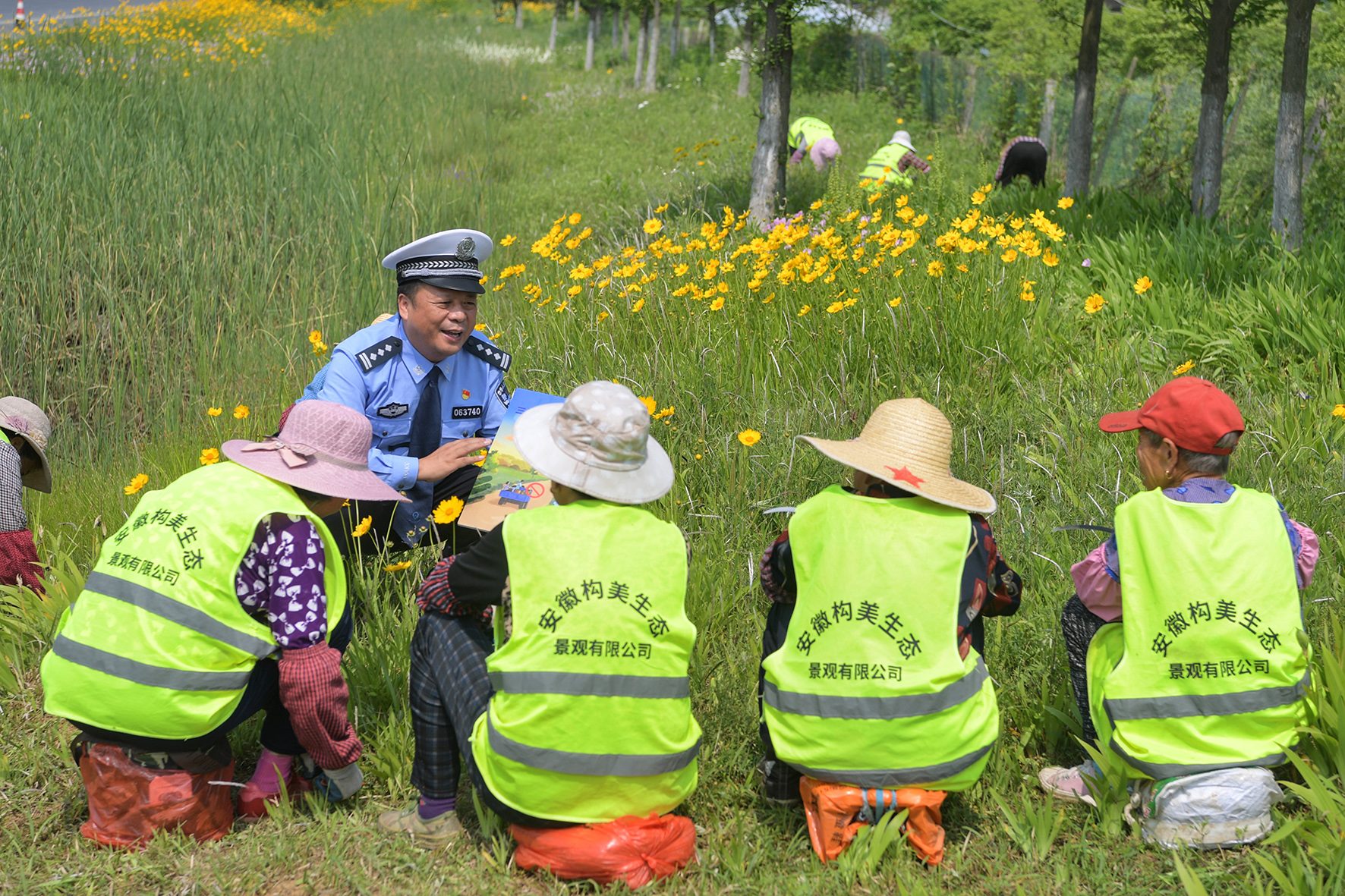 5月8日,安徽省巢湖市公安局交警大隊(duì)民警對(duì)路邊作業(yè)的綠化工人進(jìn)行交通安全宣傳。