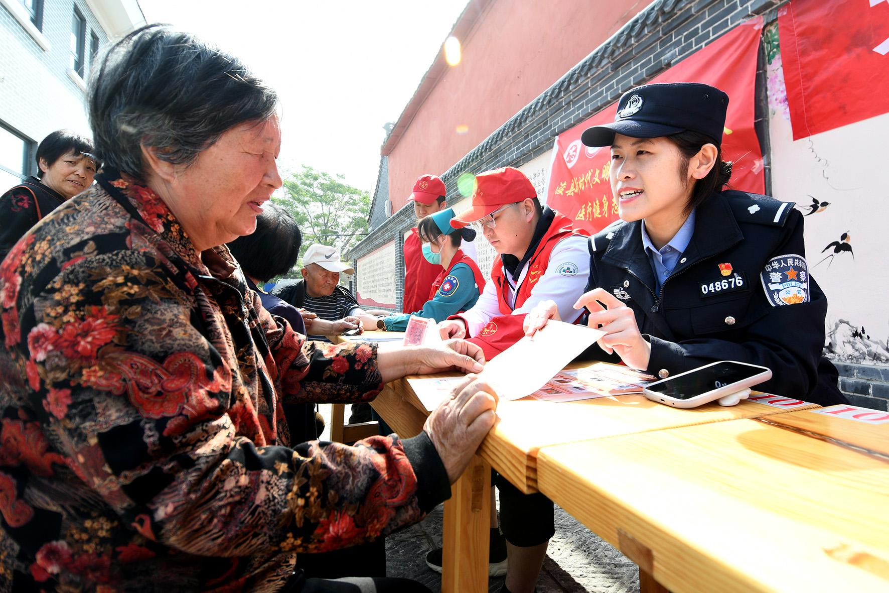 4月22日,河南省??h公安局白寺派出所民警來到轄區(qū)白寺村,面對面向老年人講解安全防范知識。