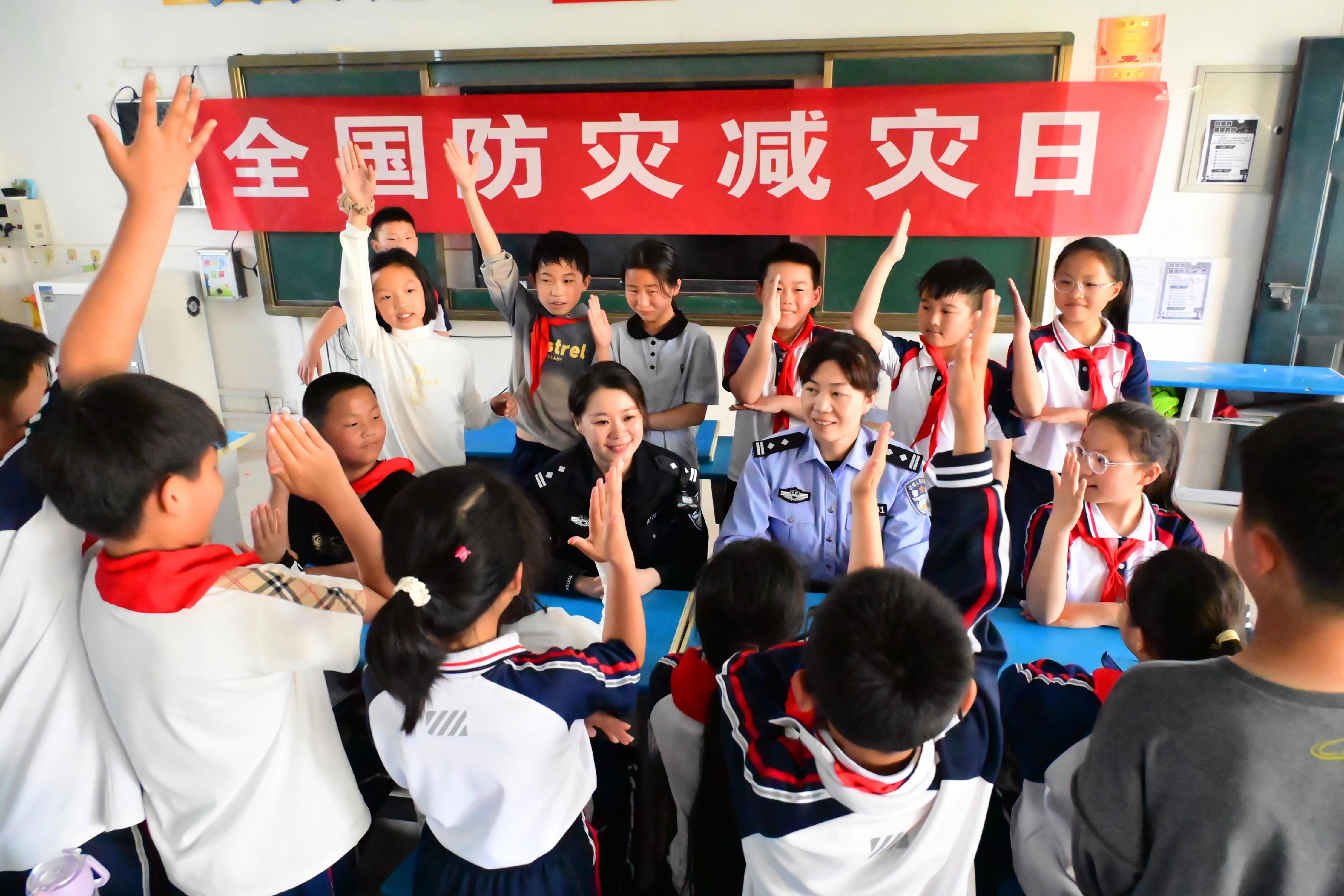 5月9日,安徽省蚌埠市固鎮(zhèn)縣公安局谷陽派出所民警在第一小學向學生們講解地震、水災、火災等各類自然災害的避險方法。