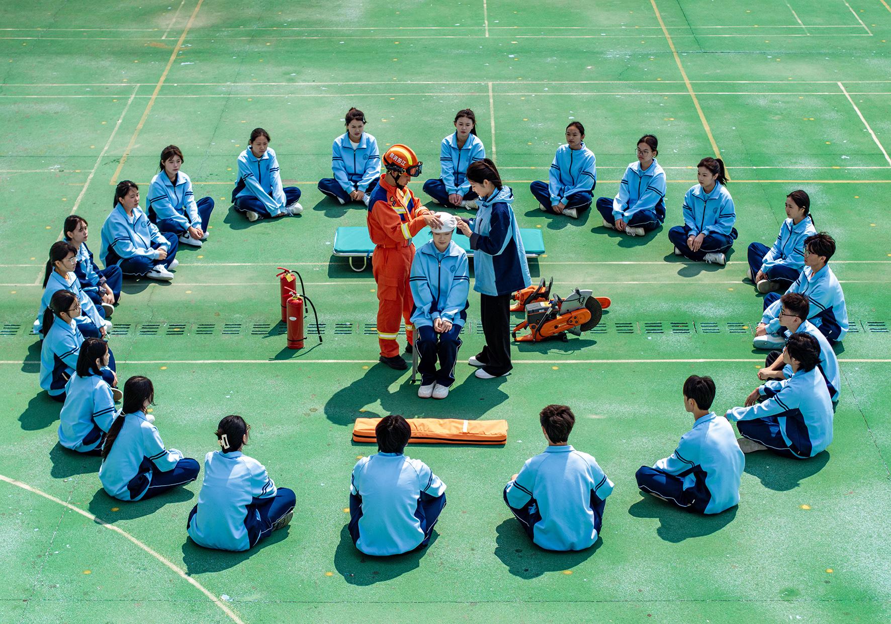 5月12日,江蘇省揚州市邗江區(qū)消防救援大隊消防員在揚州生活科技學校指導學生對傷員進行快速包扎。