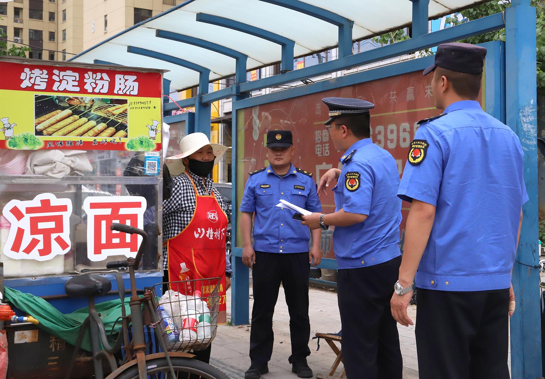6月3日,山東省郯城縣綜合執(zhí)法人員對一個(gè)高考考點(diǎn)附近的流動商販進(jìn)行勸導(dǎo)。