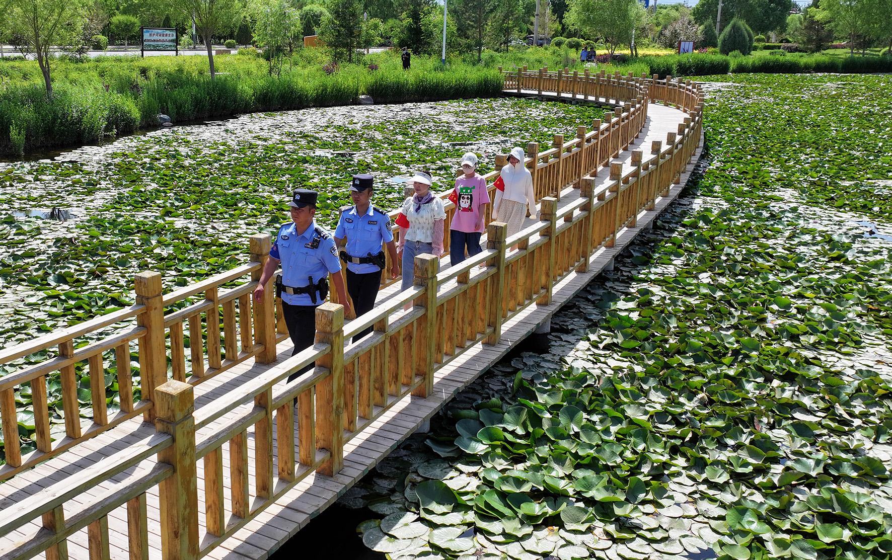 6月10日,甘肅省臨澤縣公安局沙河派出所民輔警聯(lián)合生態(tài)義警來到轄區(qū)荷花池塘進行聯(lián)防聯(lián)巡。