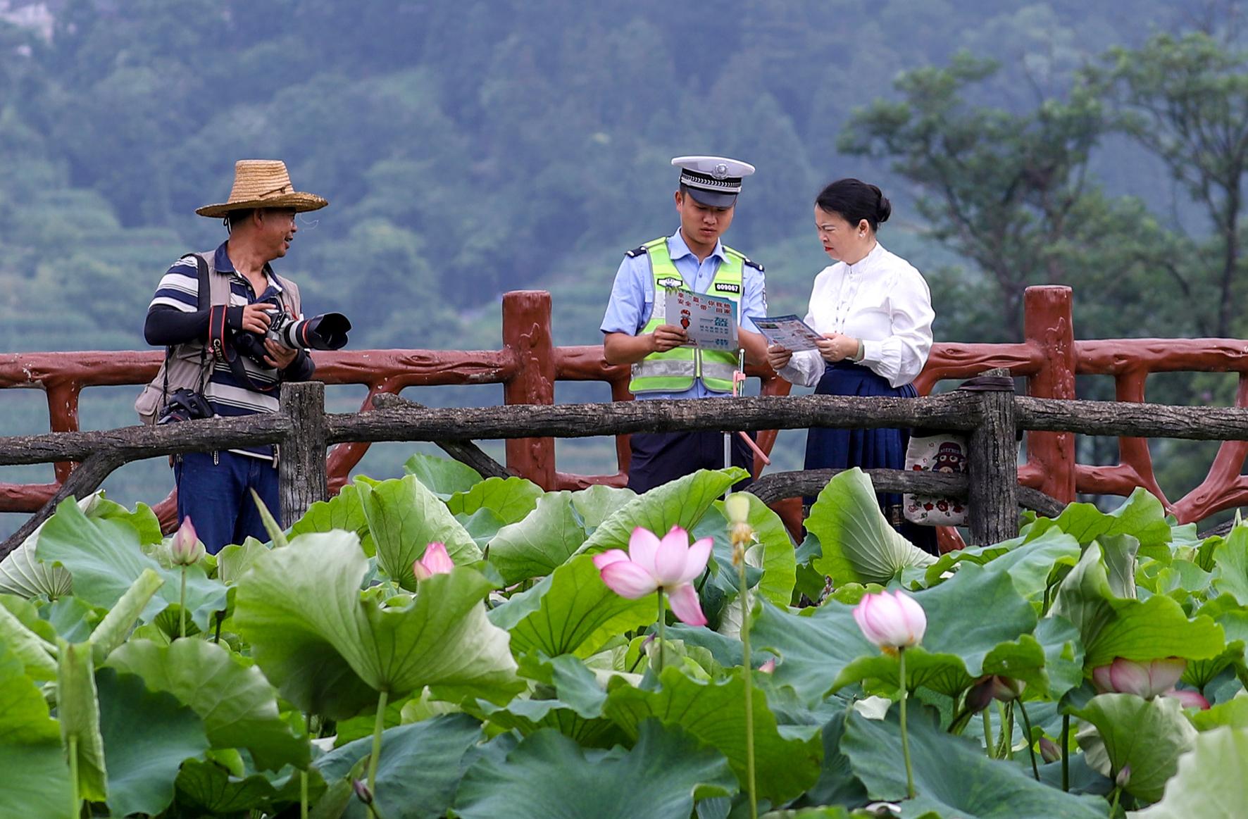 6月16日,貴州省丹寨縣交警大隊(duì)民警走進(jìn)轄區(qū)卡拉景區(qū),向觀賞荷花的游客普及道路交通安全知識(shí)。