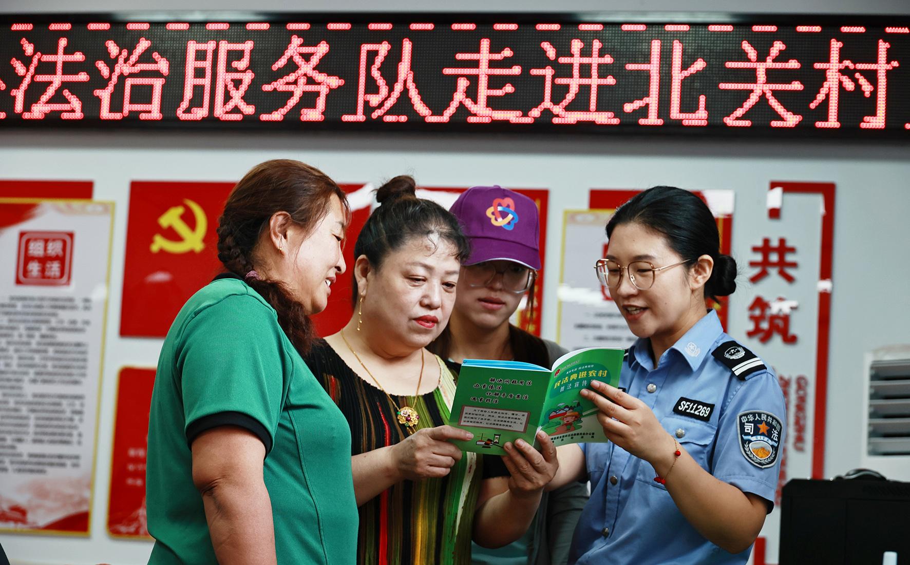 圖為法治服務(wù)隊(duì)隊(duì)員在龍興鎮(zhèn)北關(guān)村為群眾解讀法律問題。