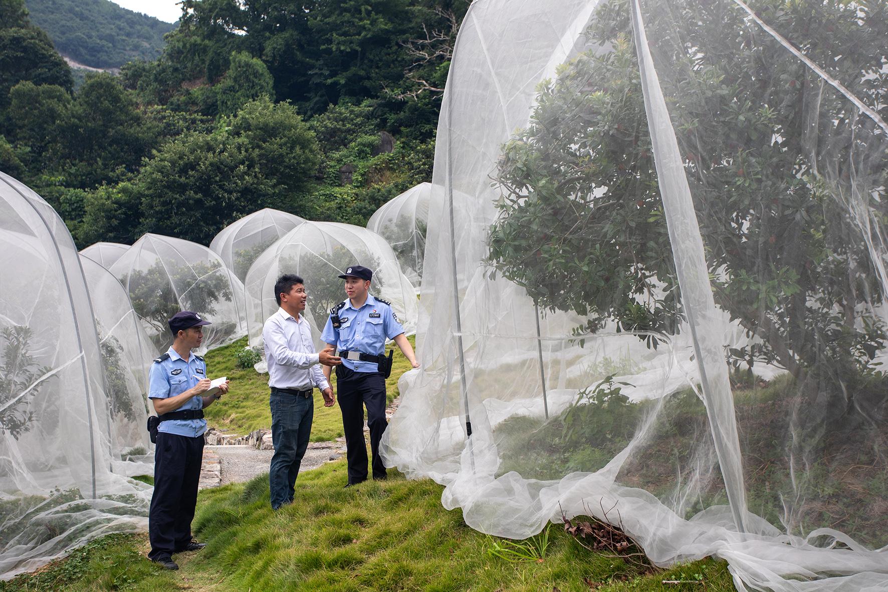 6月21日,浙江省臺州市公安局黃巖分局江口派出所民警輔警在東岙村楊梅采摘園巡邏走訪。