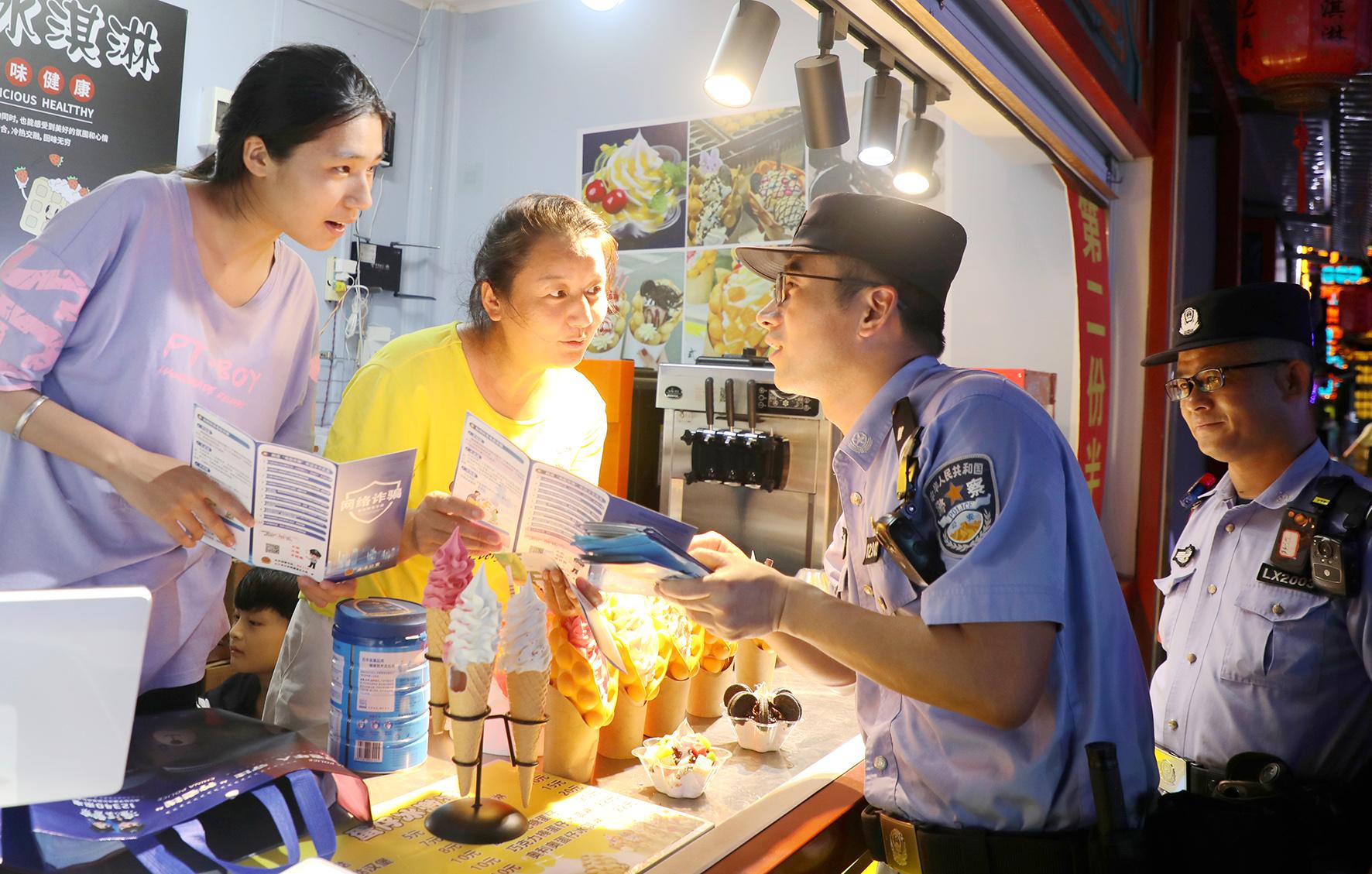 圖為7月21日,民輔警在轄區(qū)“九江之夜”開展反詐宣傳。