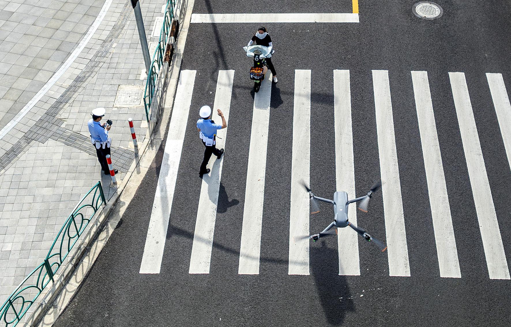圖為7月22日,民輔警利用無人機(jī)查處一起非機(jī)動(dòng)車交通違法行為。