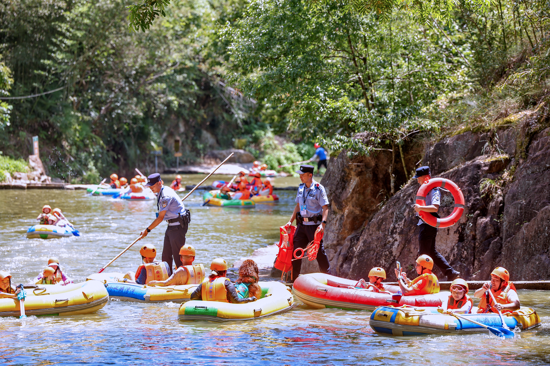 7月24日,安徽省廣德市公安局四合派出所民輔警走進(jìn)轄區(qū)響水關(guān)探險(xiǎn)漂流點(diǎn),現(xiàn)場向游客講解防溺水安全知識(shí)。