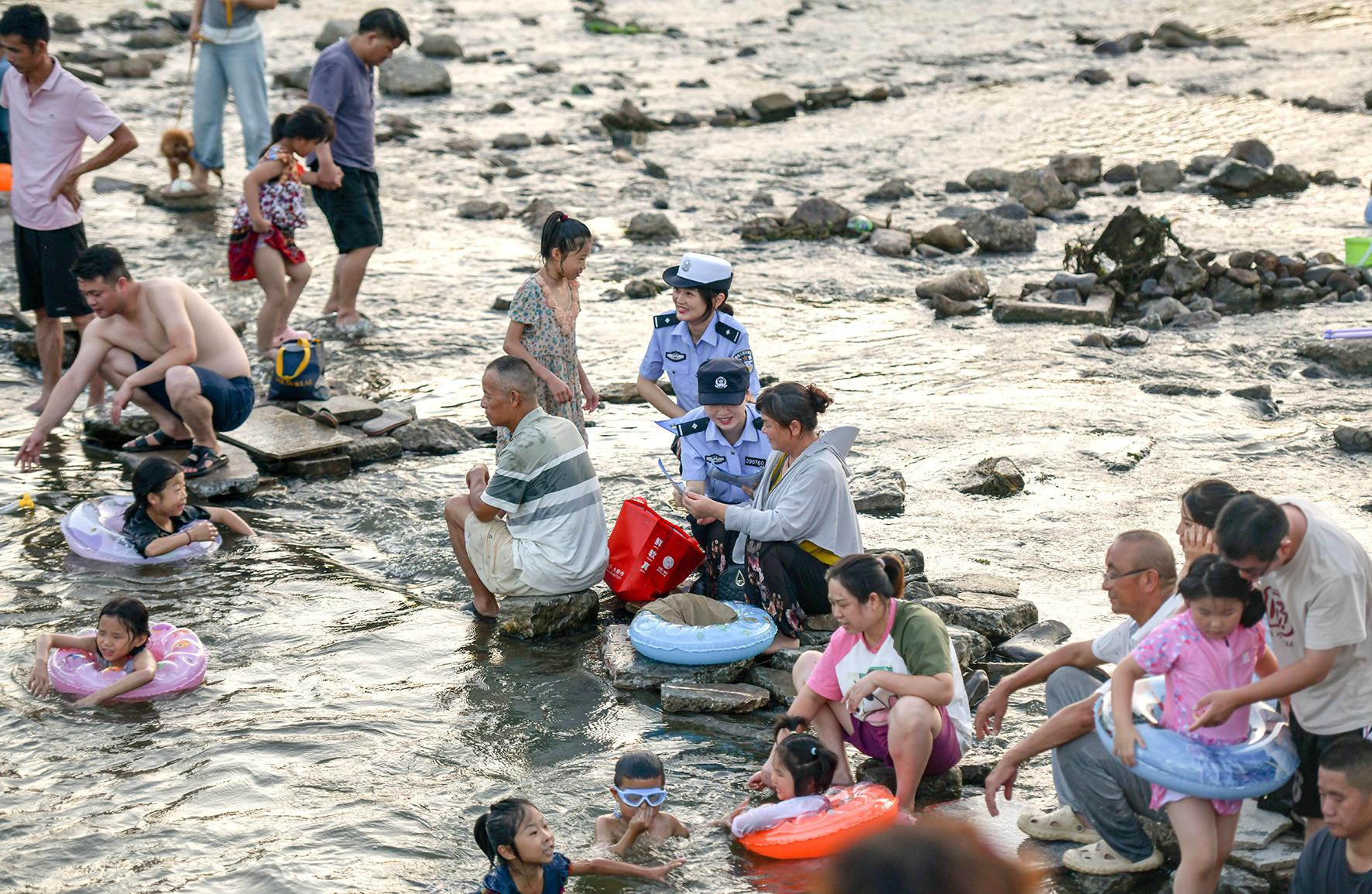 7月29日,安徽省涇縣公安局組織民警前往轄區(qū)河道,向納涼群眾開展防溺水、交通安全知識(shí)宣傳。