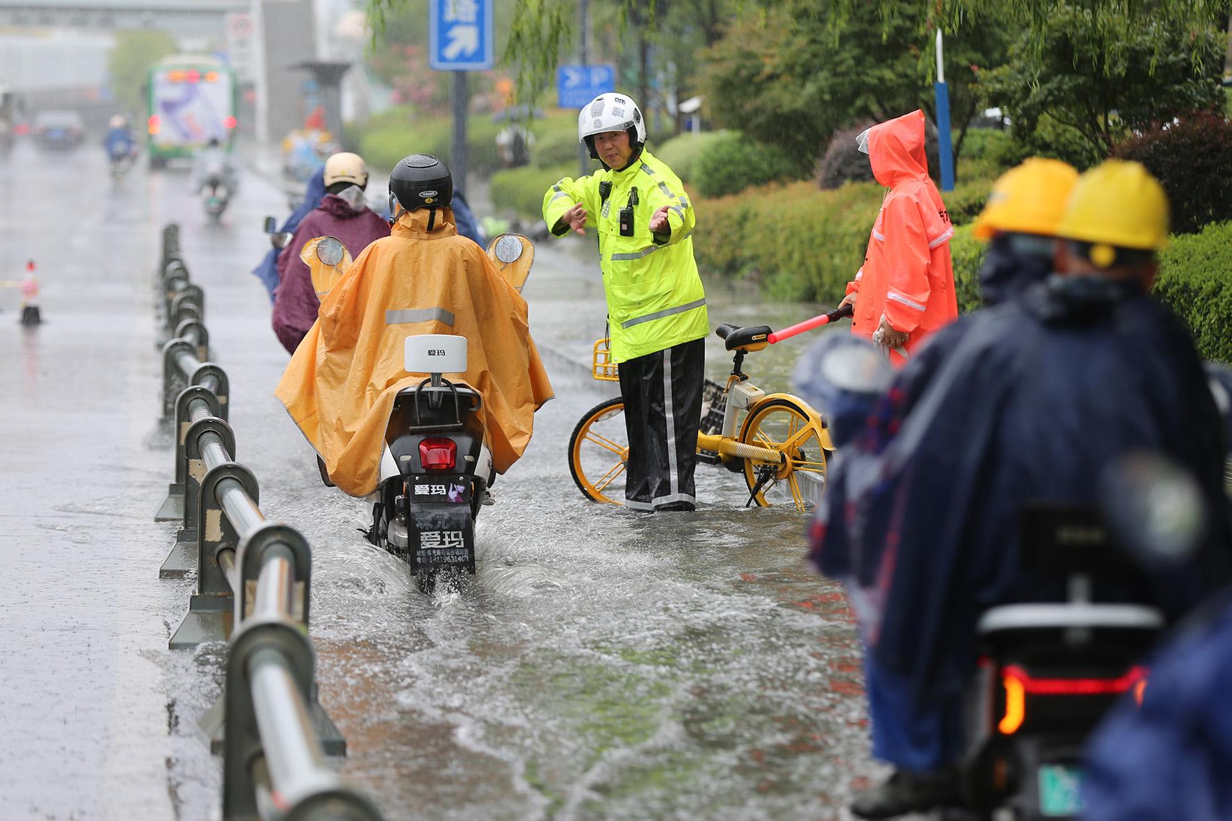 8月11日,受新一輪強降雨影響,安徽省合肥市轄區(qū)部分道路出現(xiàn)積水情況。合肥市公安局交警支隊民警及時疏導管控,提醒過往車輛注意減速、安全通行。