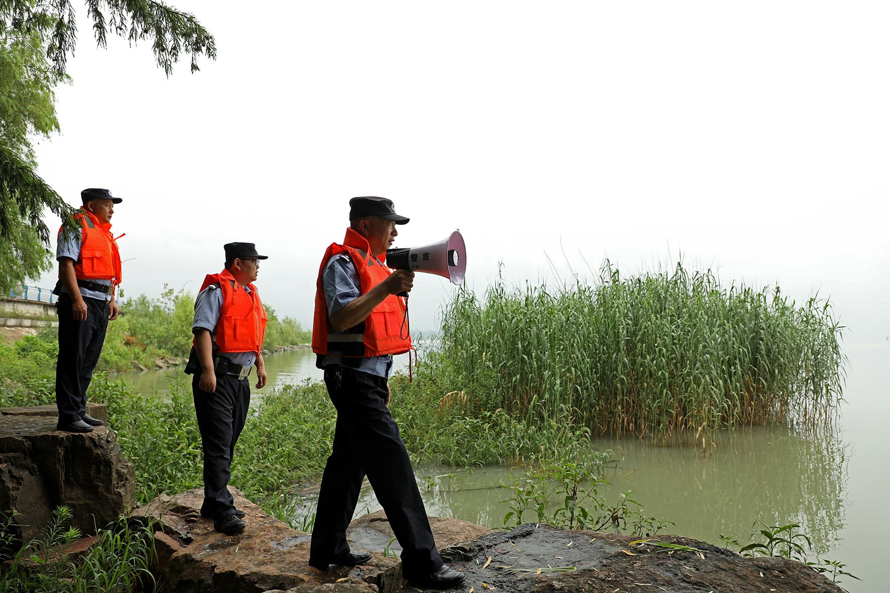8月12日,安徽省巢湖市公安局民警在巢湖水域重點(diǎn)防汛部位巡邏巡查。同時,向岸邊游玩的市民開展安全提醒,筑牢防汛安全防線。