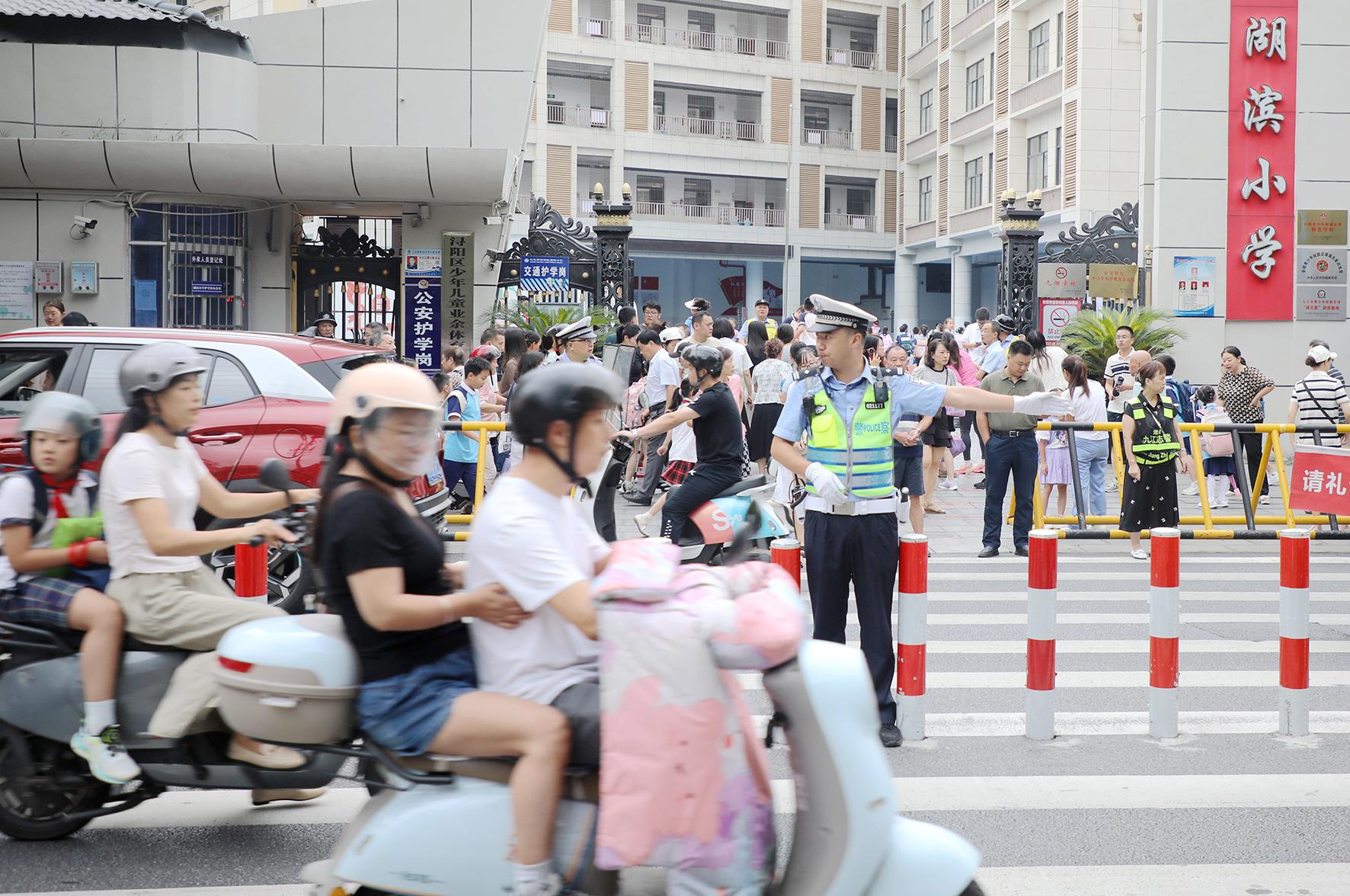 9月1日,江西省九江市公安局交管支隊(duì)潯陽(yáng)大隊(duì)民輔警在轄區(qū)學(xué)校門口維護(hù)秩序。