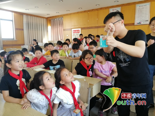 常熟理工學(xué)院“百姓城管”垃圾分類宣講團(tuán)在常熟市中小學(xué)開展“垃圾分類進(jìn)校園”科普活動(dòng)。圖為宣講團(tuán)成員通過化學(xué)實(shí)驗(yàn)給孩子們模仿重金屬離子進(jìn)入人體后產(chǎn)生的危害。竇雅莉 攝影