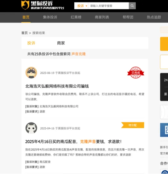 不過(guò),在眾多此類(lèi)工具中,也不乏有用戶(hù)使用后受騙的例子。記者在黑貓平臺(tái)搜索“聲音克隆”發(fā)現(xiàn),有多名用戶(hù)曾對(duì)此進(jìn)行投訴。