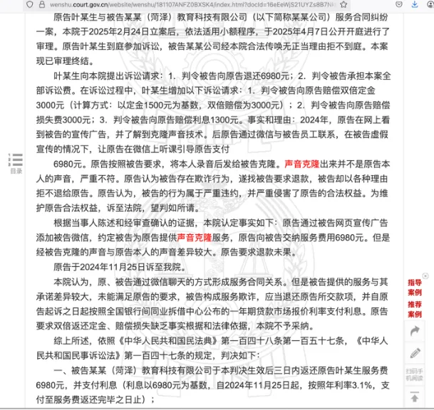 同時(shí),記者在裁判文書(shū)網(wǎng)中查詢(xún)到今年6月的一起民事案件,原告的訴求同樣是克隆聲音效果差,要求返還6980元的服務(wù)費(fèi)。