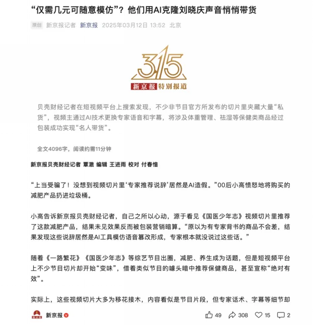 比如,新京報(bào)曾報(bào)道僅需幾元可隨意模仿明星聲音,商家用AI克隆劉曉慶的聲音悄悄帶貨。南方日?qǐng)?bào)報(bào)道過(guò)全紅嬋及家人的聲音被AI合成冒充帶貨,等等。