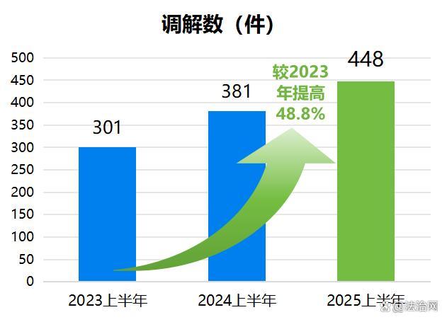 2025年上半年,以調解方式結案448件,較2024年上半年的381件提高17.6%,較2023年上半年的301件增幅高達48.8%,數量實現(xiàn)跨越式增長。調解案件數量的顯著增加,有力促進了矛盾糾紛的實質性化解,提升了貴仲的仲裁公信力和群眾滿意度。