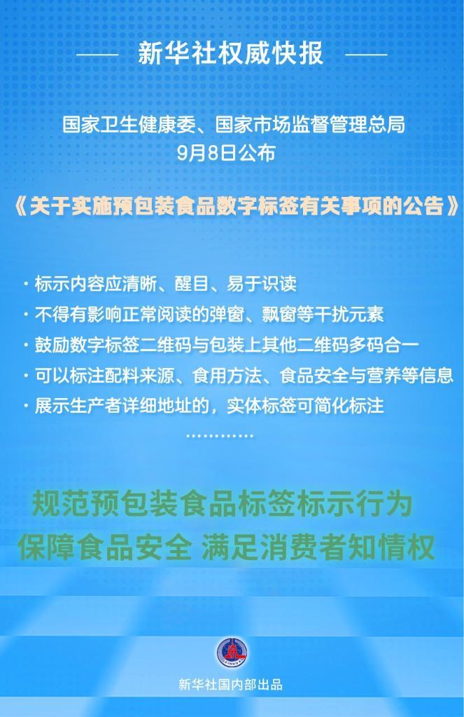 國家衛(wèi)生健康委、國家市場監(jiān)督管理總局9月8日公布《關(guān)于實施預包裝食品數(shù)字標簽有關(guān)事項的公告》。