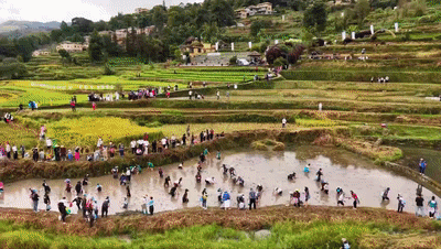在云南省紅河州,元陽(yáng)哈尼小鎮(zhèn)國(guó)慶假期舉辦了首屆哈尼梯田泥濘挑戰(zhàn)賽?!澳嗟貙殹薄疤萏锇魏印薄暗咎锊遏~(yú)”等項(xiàng)目趣味十足。300余名參賽選手們?cè)谔萏镩g奔跑,體驗(yàn)別樣的農(nóng)耕樂(lè)趣。