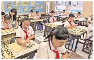 圖為九月十一日,新疆維吾爾自治區(qū)哈密市豫哈第三實驗學(xué)校學(xué)生在寬敞整潔的書法教室里臨摹學(xué)習(xí)書法。