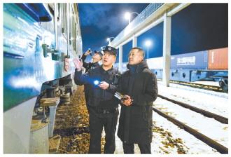 圖為1月14日,《法治日?qǐng)?bào)》記者(右)跟隨霍爾果斯出入境邊防檢查站移民管理警察,檢查一列即將出境的中歐班列車體。 本報(bào)通訊員 吳晨龍 攝