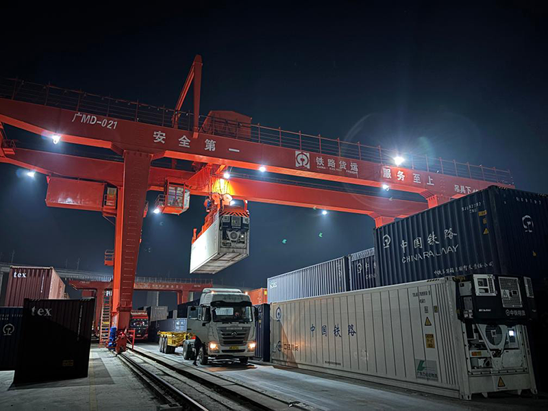 1月17日凌晨,在湖南懷化國(guó)際陸港,龍門吊正在將冷鏈集裝箱吊裝到卡車上。新華社記者余春生 攝